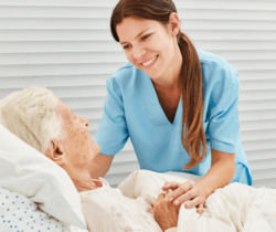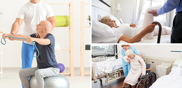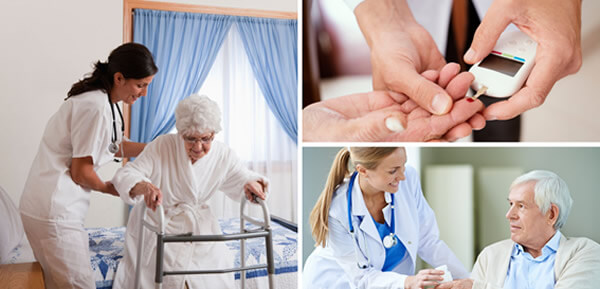 Enfermeiros, Auxiliares e Técnicos. Medicação no horário, higienização do paciente, curativos, auxílio na alimentação e locomoção. Campainha de emergência para chamada de enfermeira.